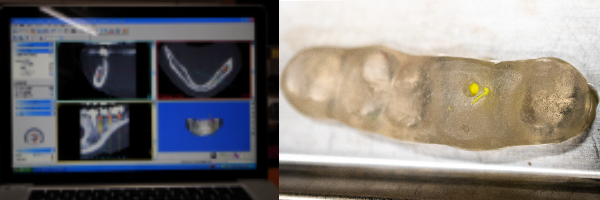 必要に応じ専属技工士が作るガイドを用いてコンピューターのズレを補正し検査を行います。インプラント埋入位置や歯茎の切開線などを決めます。