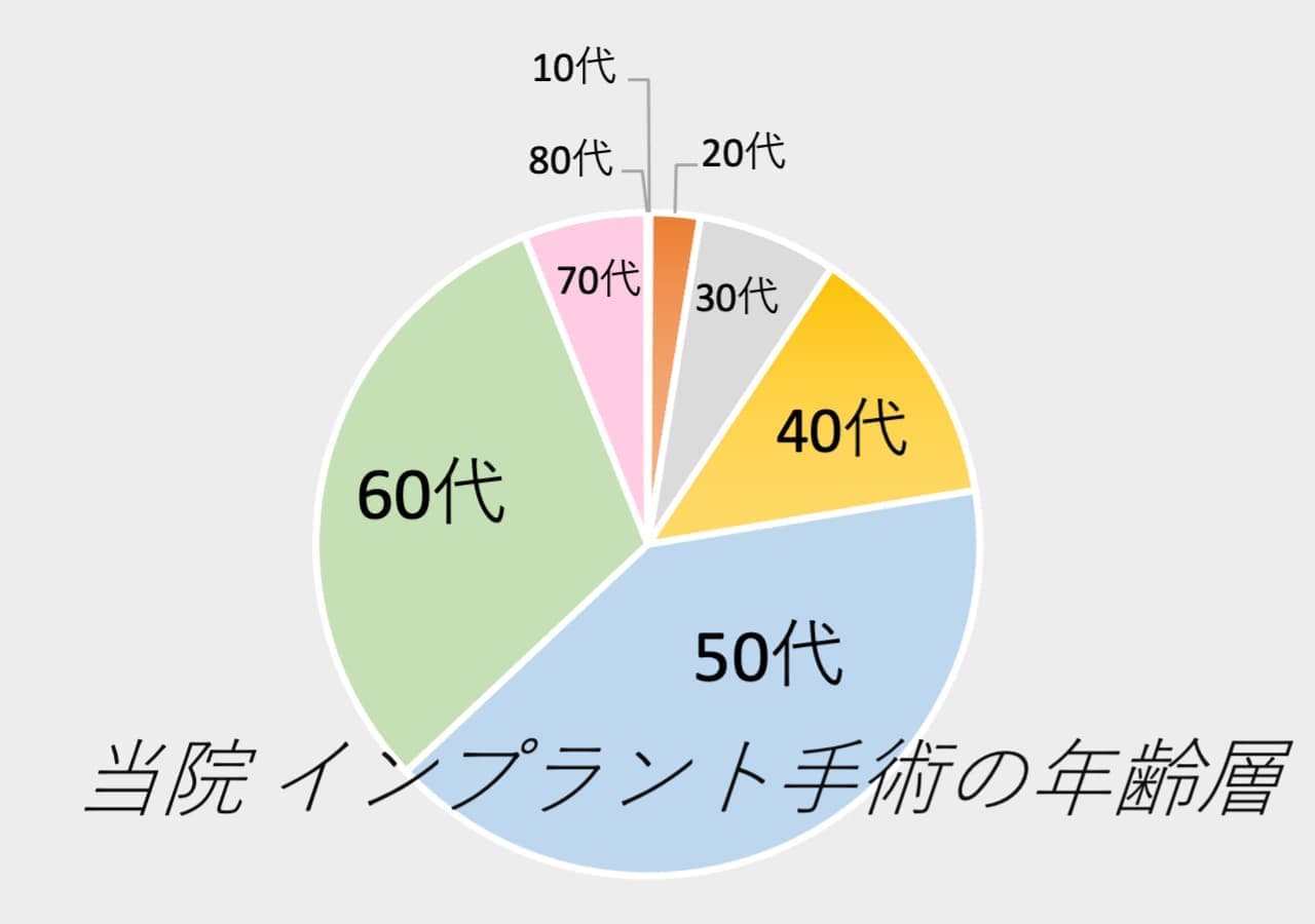 当院でインプラント手術を受けた方の年齢層は多岐に渡ります。ひとりひとりライフプラン、ライフステージやお体の状態は異なりますが、